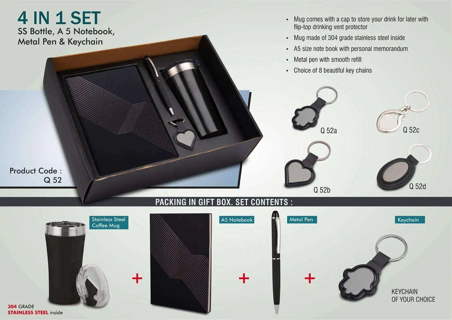 4 in 1 set: Tall sipper mug in 304 steel, Metal pen, A5 notebook and Keychain