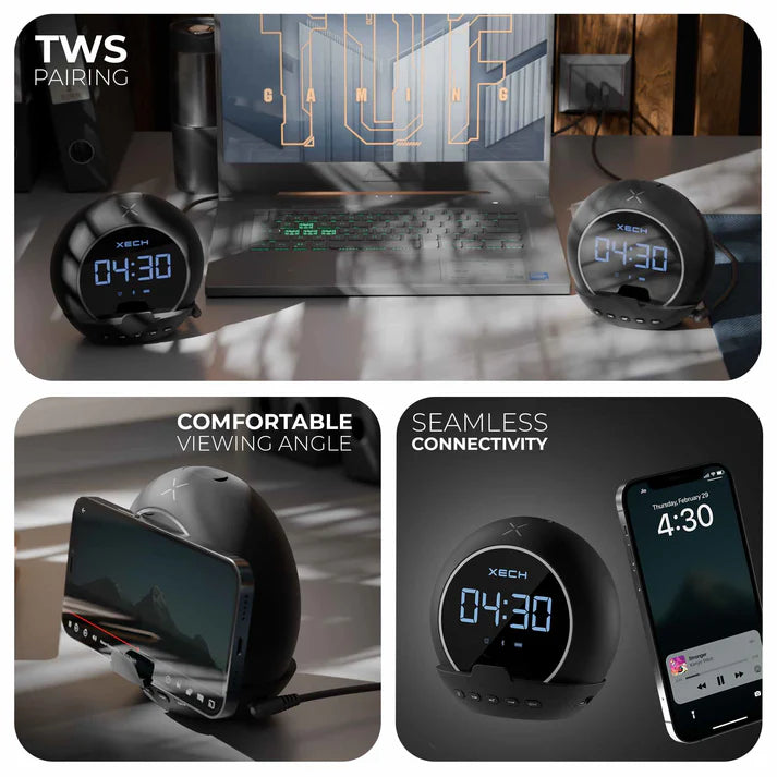 This sleek and compact wireless marvel combines a 5W speaker, digital clock, and alarm. Immerse yourself in high-quality audio, stay organized, and wake up on time.